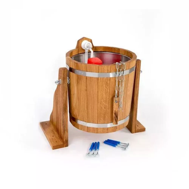 Обливное устройство 16л с нержавеющей вставкой из кавказского дуба. Толщина дерева 15мм, крашеное фанерное дно с отверстием для устранения влаги между вставкой и деревом,уплотнительный обод из нержавеющей стали. Настенный кронштейн выполнен из дуба, деревянная ручка с нержавеющей цепочкой, крепеж и клапан подачи воды в комплекте.