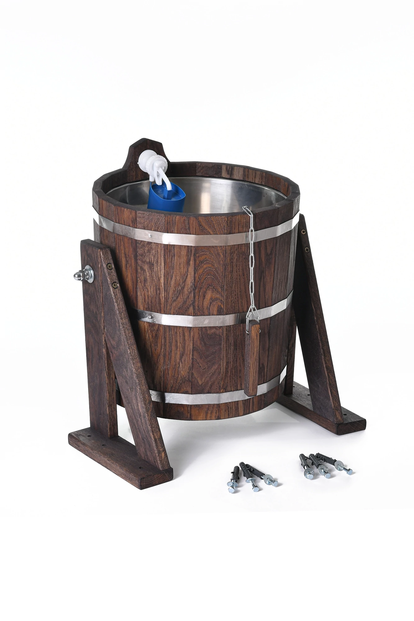 Обливное устройство 20л морёный с нержавеющей вставкой из кавказского дуба. Толщина дерева 15мм, крашеное фанерное дно с отверстием для устранения влаги между вставкой и деревом,уплотнительный обод из нержавеющей стали. Настенный кронштейн выполнен из дуба, деревянная ручка с нержавеющей цепочкой, крепеж и клапан подачи воды в комплекте.