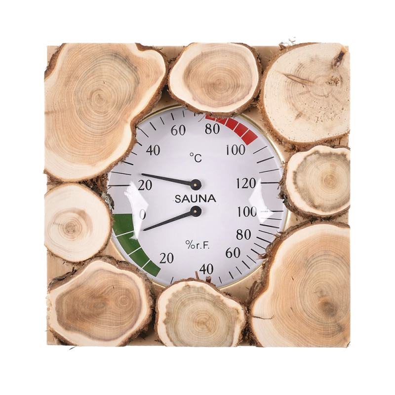 Измерительный прибор температуры и влажности из спилов можжевельника на основании из липы