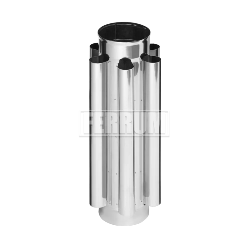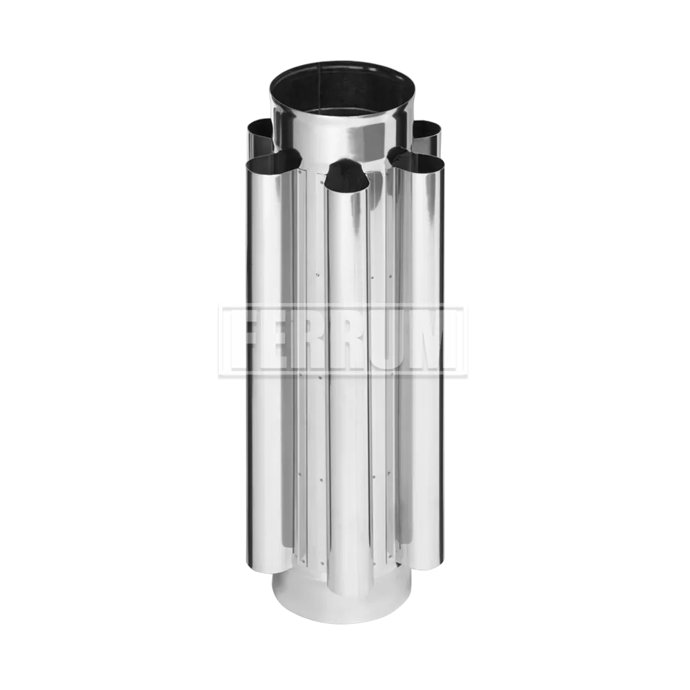 Дымоход-конвектор марки Ferrum сконструирован таким образом, что выполняет функцию отвода продуктов горения и обогревательного прибора одновременно. Чаще всего подобные модели устанавливают в банных и обычных отопительных печах, работающих на твердом топливе. В нашем магазине Ferrum.shop можно купить дымоход конвектор по выгодной цене. Изделие представляет собой одностенный цилиндр диаметром, дополненный шестью ребрами конвекции, обеспечивающими ускоренный прогрев помещения от тепла дымовой трубы. Изготовлен дымоход-конвектор Ferrum из специальной жаростойкой нержавеющей стали, способной выдерживать температуру до +450 °С. Благодаря раструбу на концах можно без проблем состыковать нужное количество элементов. Изделие отличается не только эффективностью, но и продуманным дизайном – лаконичным и современным.