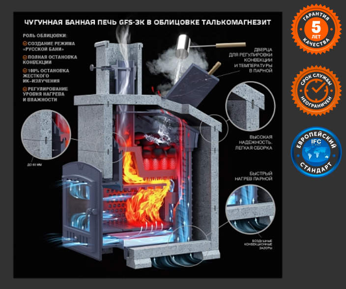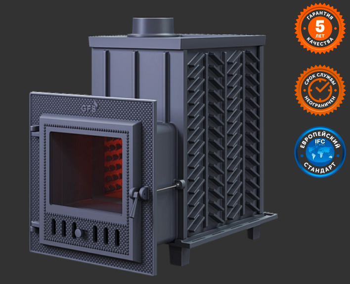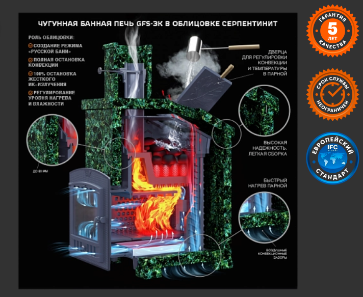 GFS-ЗК 30 (М) - печь с усиленной каменкой большей массы, с единым углублением внутрь топки для дополнительной укладки чугунного заряда. Теплосъемные шипы, со стороны горения пламени, в разы увеличивают площадь соприкосновения огня с каменкой и ускоряют передачу тепла, а также способствуют лучшему дожигу смешивая потоки пламени и воздуха поступаемого из воздушника. Эти усовершенствования значительно повышают мощность парообразования печи и выдают большее количество пара при непрерывной подаче воды. Каменка печей GFS-ЗК является незаливаемой.