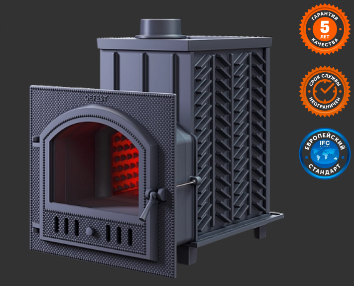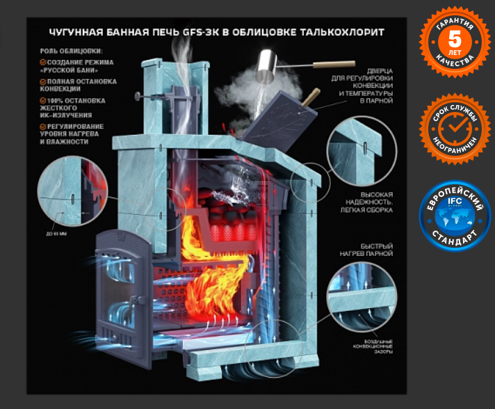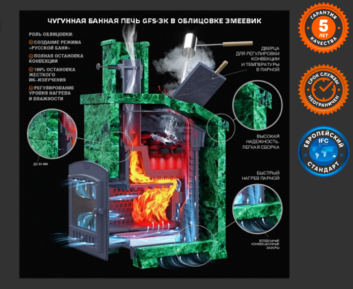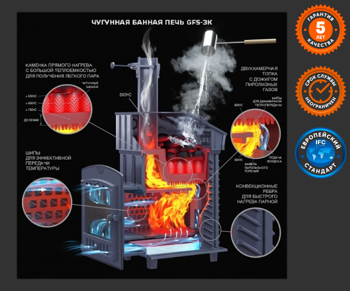 GFS-ЗК 30 (П) - печь с усиленной каменкой большей массы, с единым углублением внутрь топки для дополнительной укладки чугунного заряда. Теплосъемные шипы, со стороны горения пламени, в разы увеличивают площадь соприкосновения огня с каменкой и ускоряют передачу тепла, а также способствуют лучшему дожигу смешивая потоки пламени и воздуха поступаемого из воздушника. Эти усовершенствования значительно повышают мощность парообразования печи и выдают большее количество пара при непрерывной подаче воды. Каменка печей GFS-ЗК является незаливаемой.