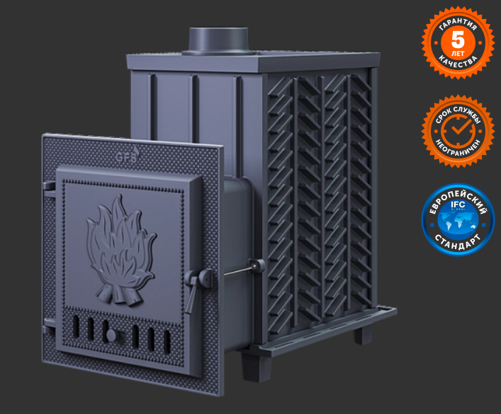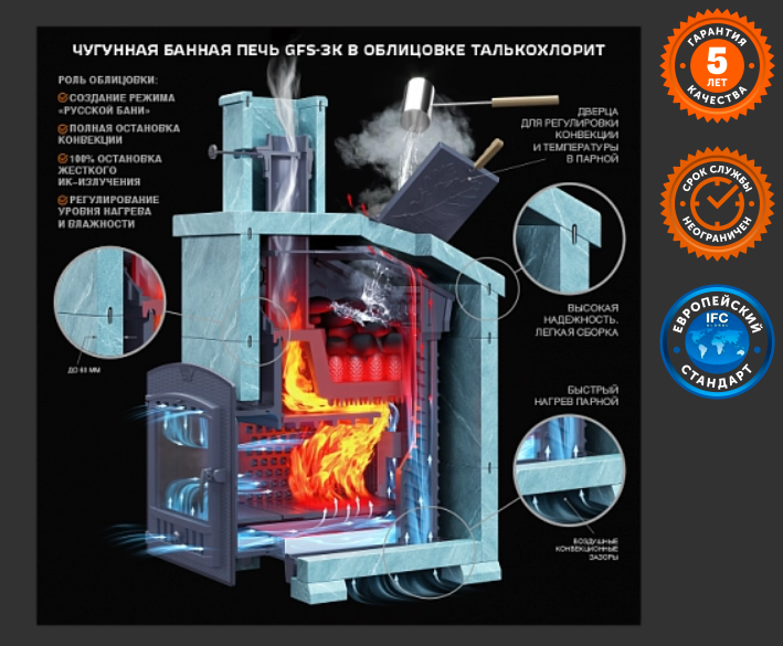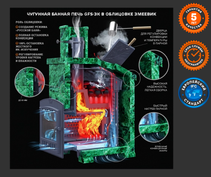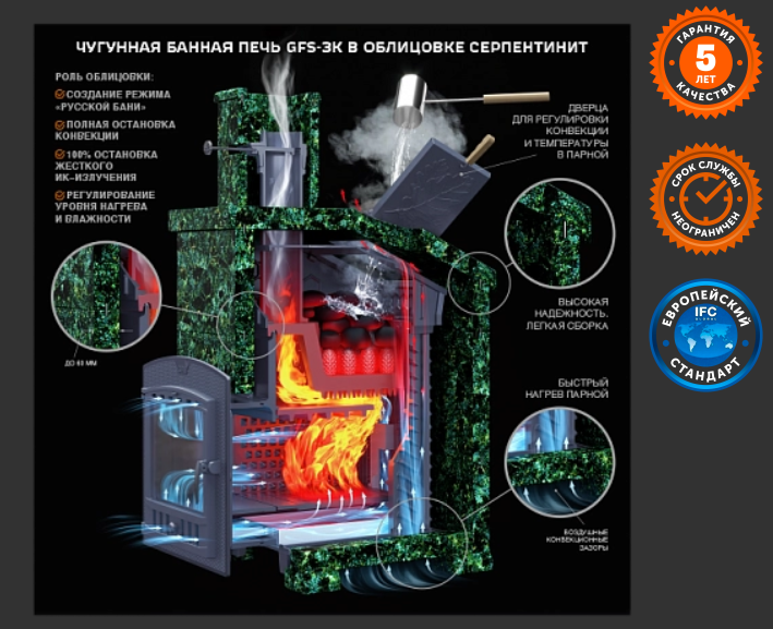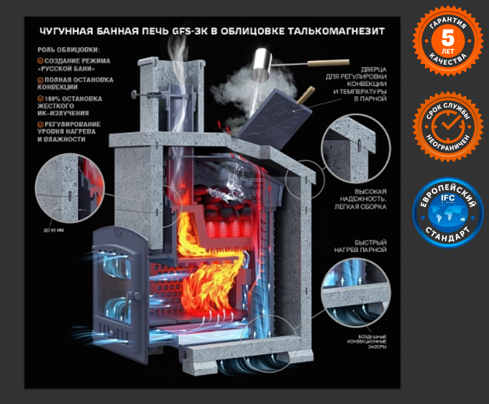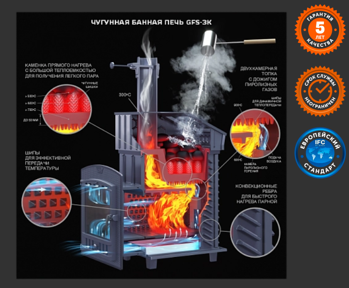 GFS-ЗК 30 - печь с усиленной каменкой большей массы, с единым углублением внутрь топки для дополнительной укладки чугунного заряда. Теплосъемные шипы, со стороны горения пламени, в разы увеличивают площадь соприкосновения огня с каменкой и ускоряют передачу тепла, а также способствуют лучшему дожигу смешивая потоки пламени и воздуха поступаемого из воздушника. Эти усовершенствования значительно повышают мощность парообразования печи и выдают большее количество пара при непрерывной подаче воды. Каменка печей для бани GFS-ЗК является незаливаемой.
