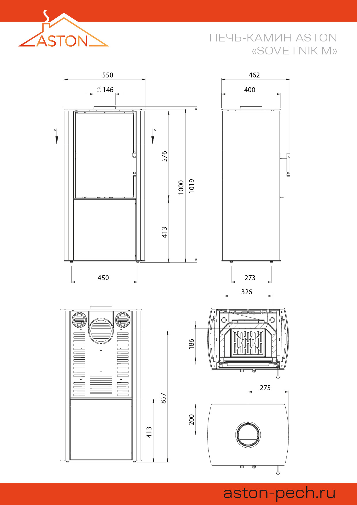 Печь-Камин ASTON "SOVETNIK М" диаметр дымохода: 150 мм