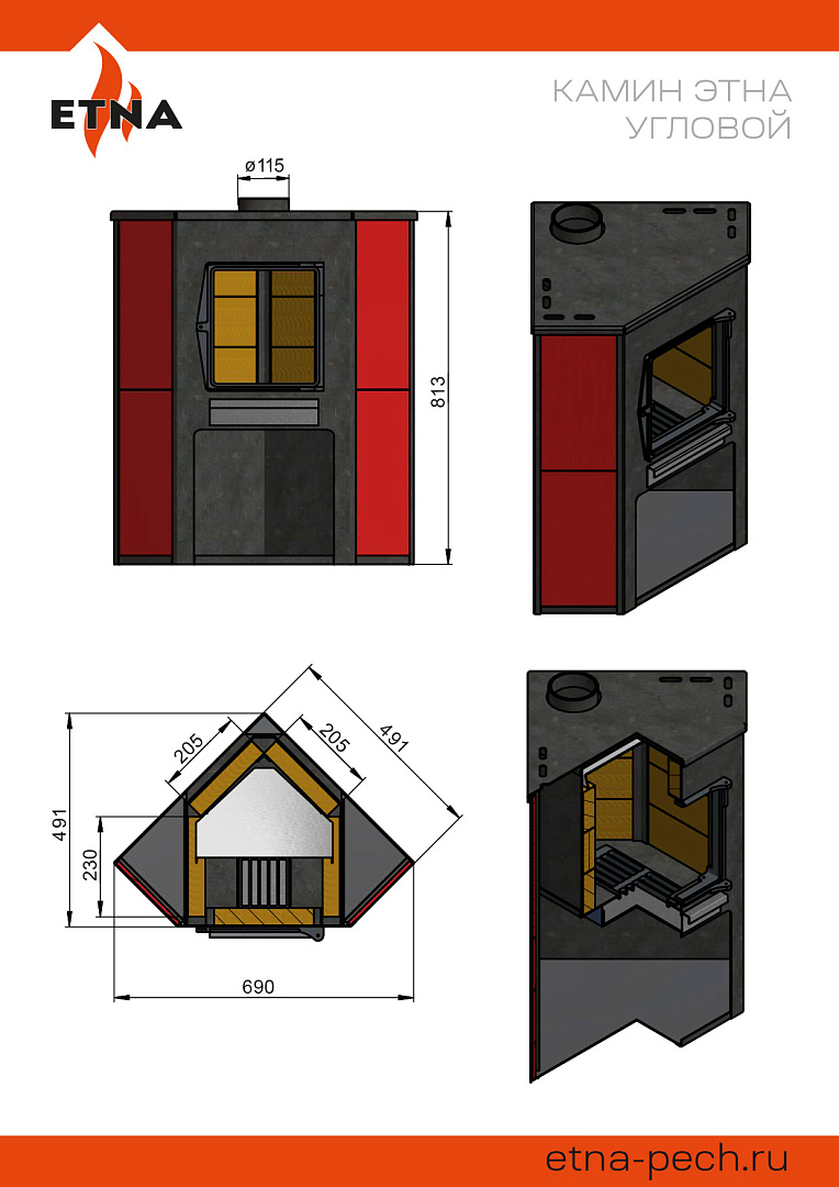 Камин ЭТНА (ДТ-4С) угловой Ø115мм диаметр дымохода: 115 мм