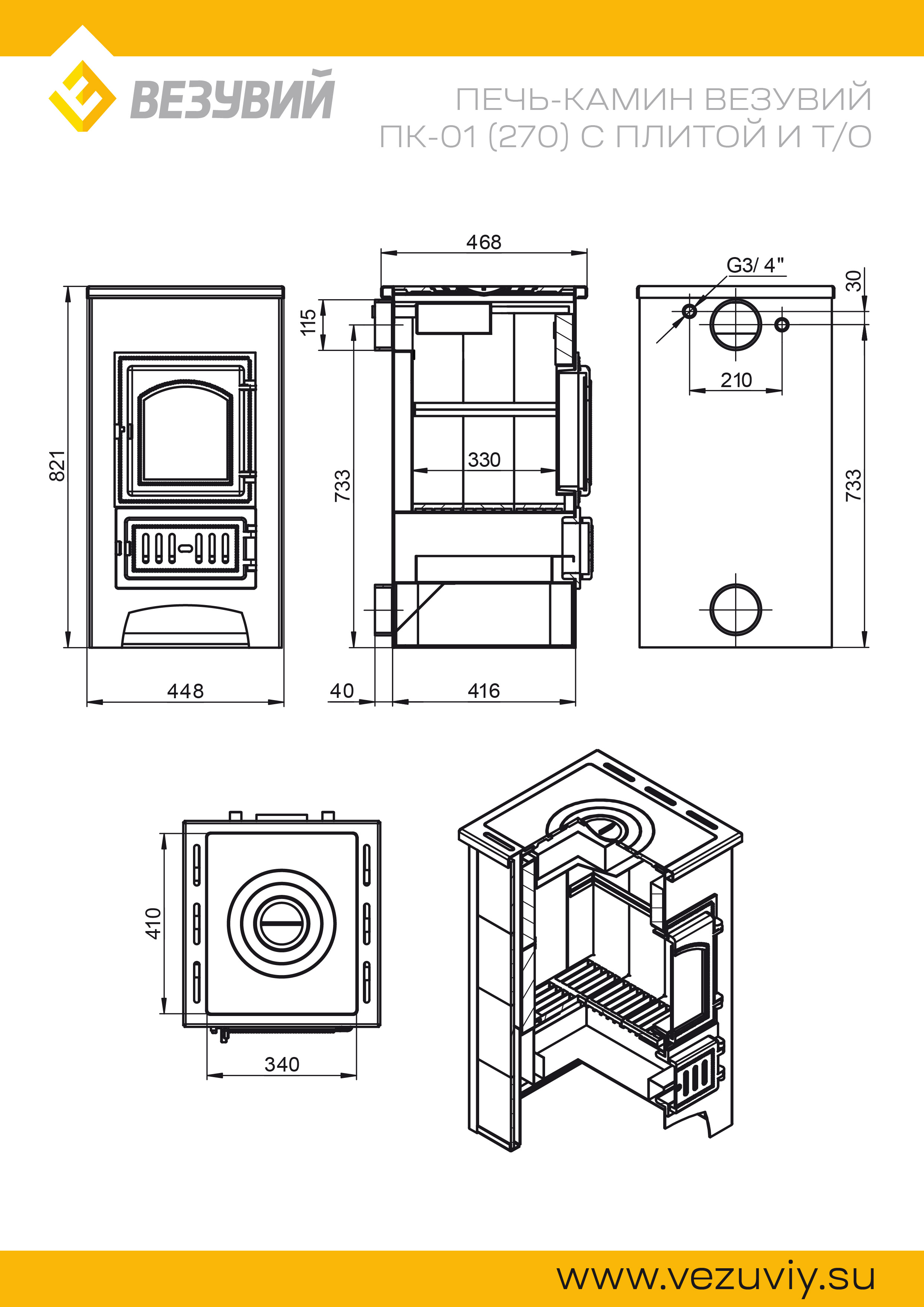 Печь-Камин ВЕЗУВИЙ ПК-01 (270) с плитой и т/о красн. 9 кВт (150 м3) Ø 115 мм диаметр дымохода: 115 мм