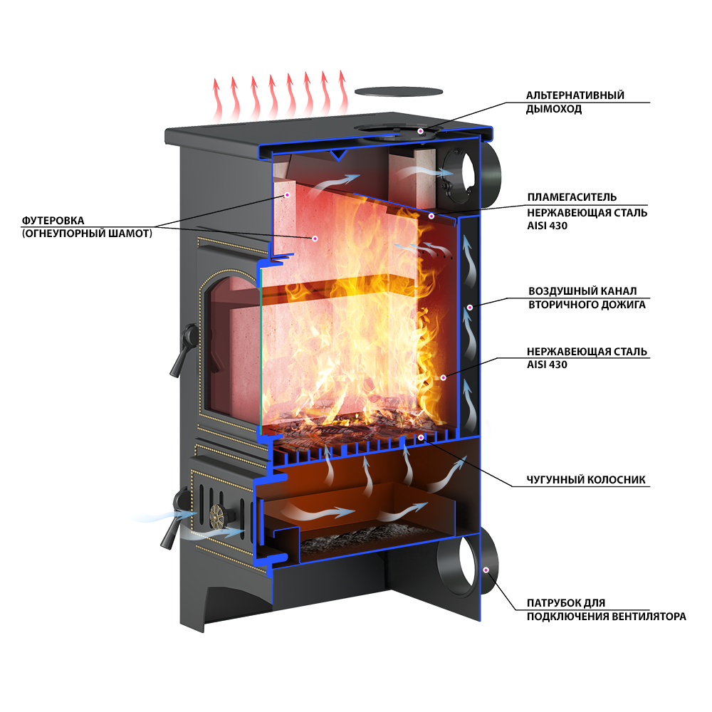Печь-Камин ВЕЗУВИЙ ПК-01 (270) талькохлорит 9 кВт (150 м3) Ø 115 мм диаметр дымохода: 115 мм