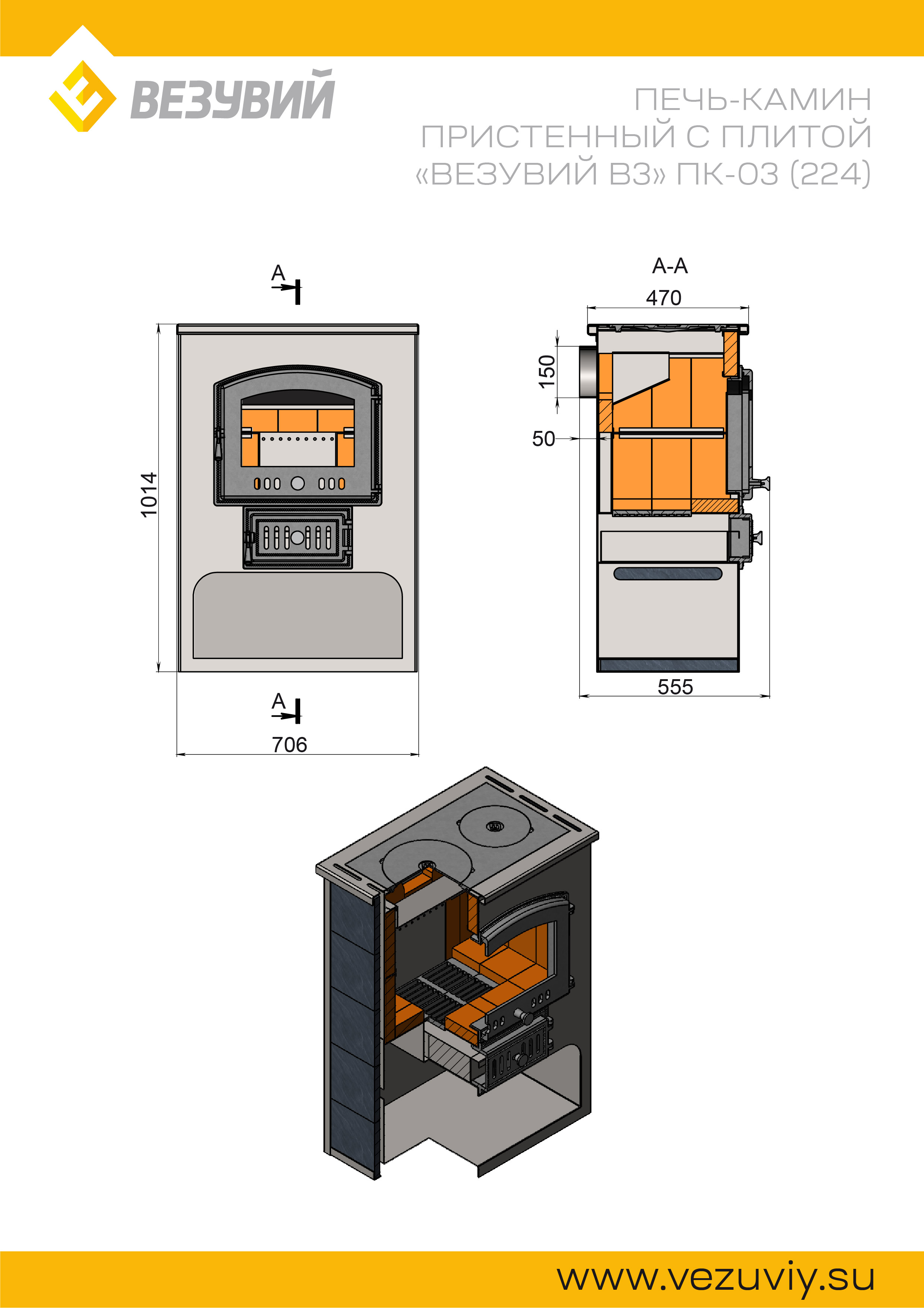 Печь-Камин ВЕЗУВИЙ ПК-03 (224) с плитой "Везувий В3" талькохлорит 12 кВт (200 м3) Ø150мм диаметр дымохода: 150